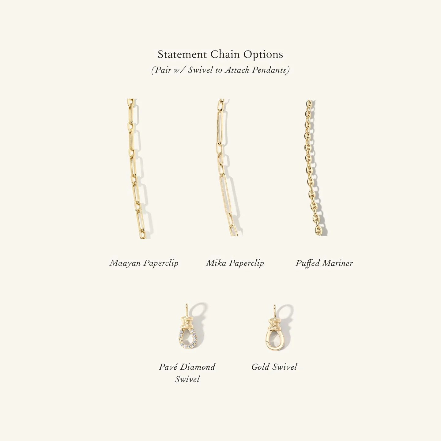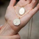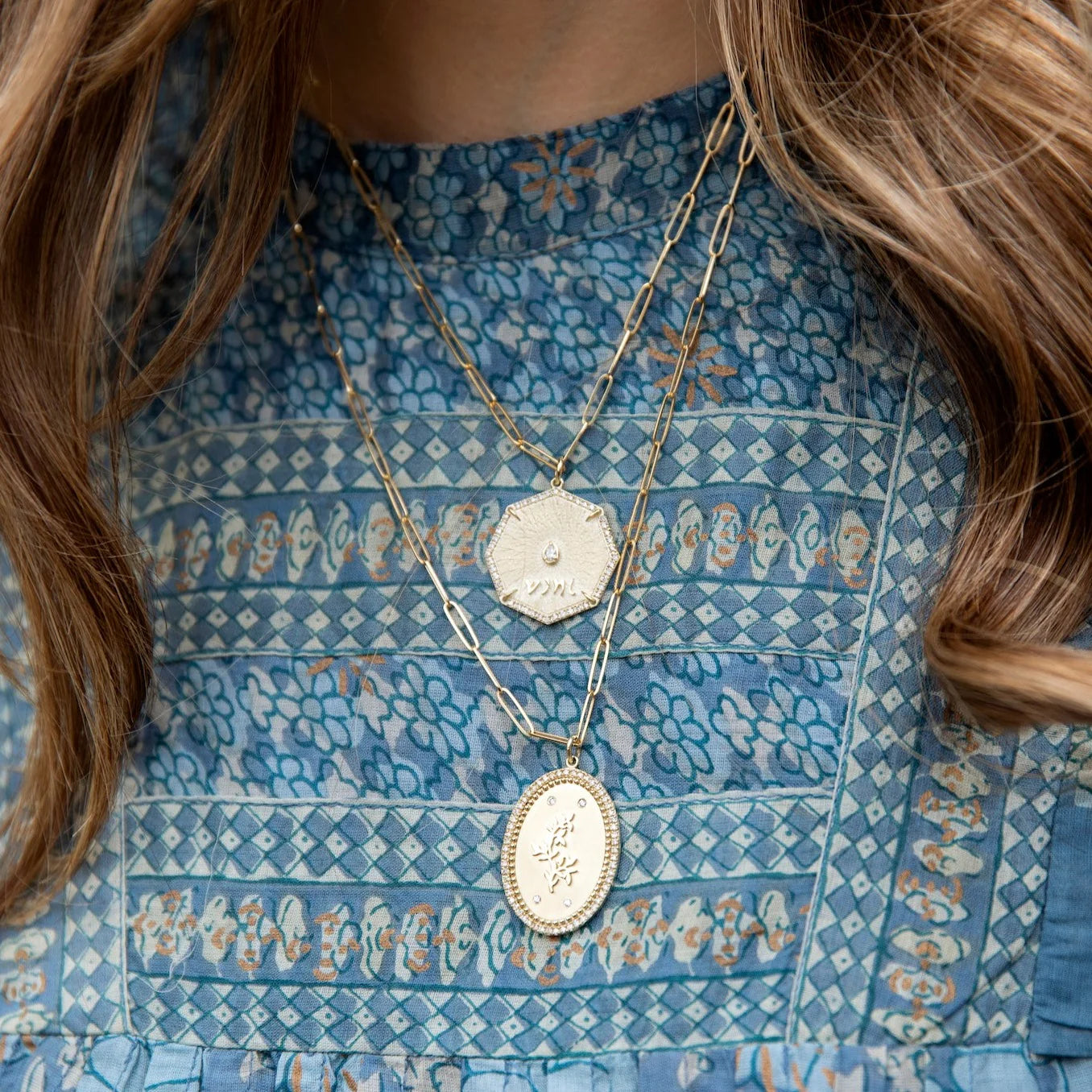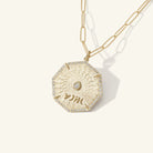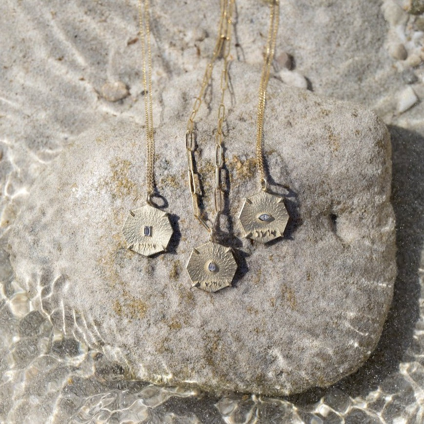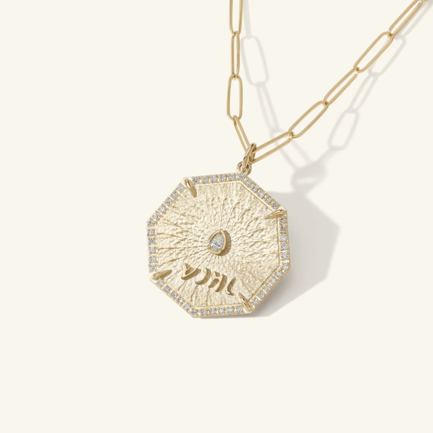 An octagon shaped pendant surrounded by Pavé Diamonds and sculpted in 10 carat gold. Engraved with the word “Seek” written in Aramaic on the front.