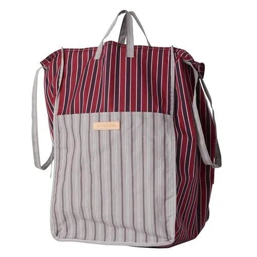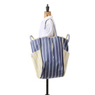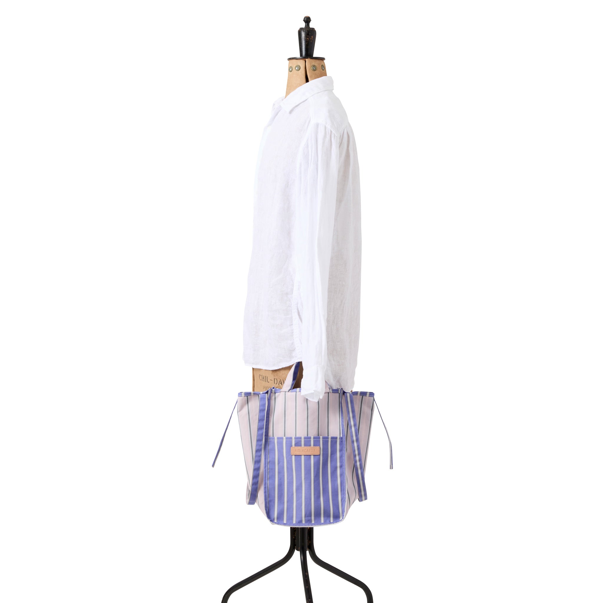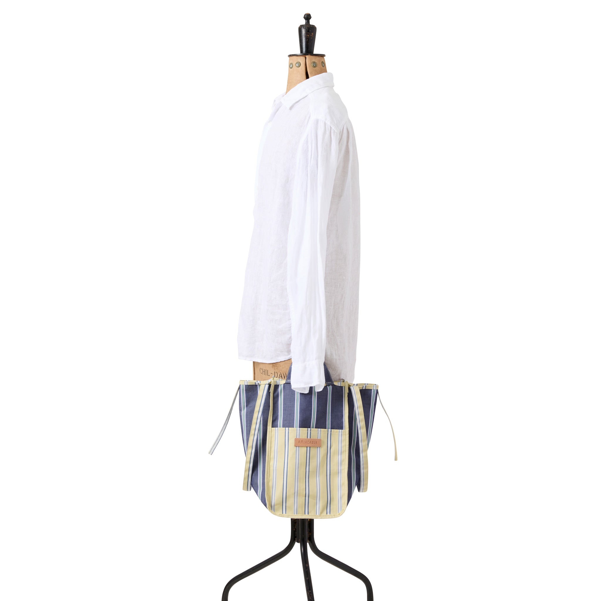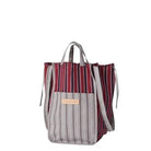 Unlined with a tall rectangular shape, handles and a shoulder strap for carrying. A new Amiacalva design in a striped pattern with both Pink and Blue, and Yellow and Navy color palette.