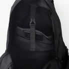 Unlined backpack with 2 exterior zipped pockets, 2 interior pockets, and 2 side pockets with snap closure for easy access.