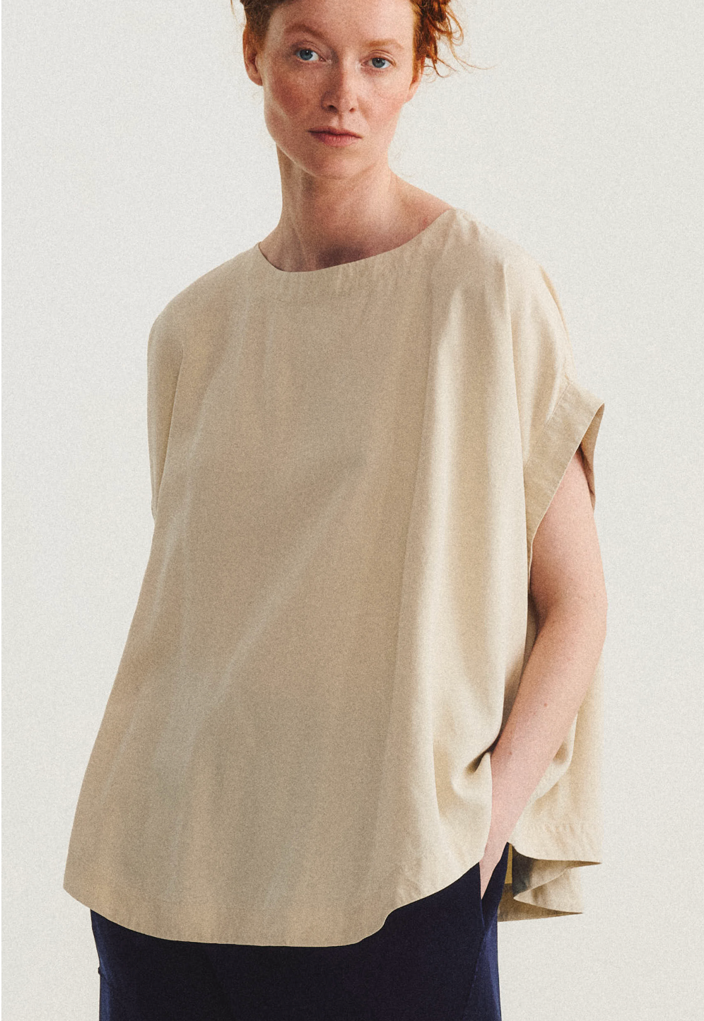 Short sleeve, loose fitting blouse in a spun silk.