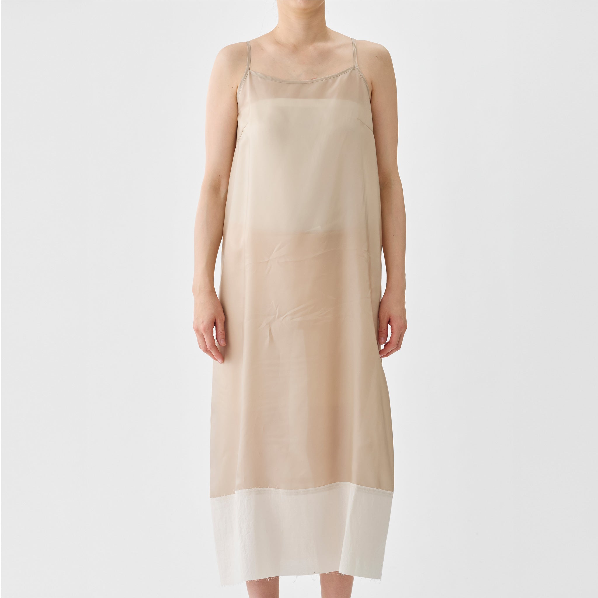 Style: Cupro long under camisole dress. Hem features the use of a lawn material. When layered, the cutoffs details that peek out from the hem are typical of pas de calais style.