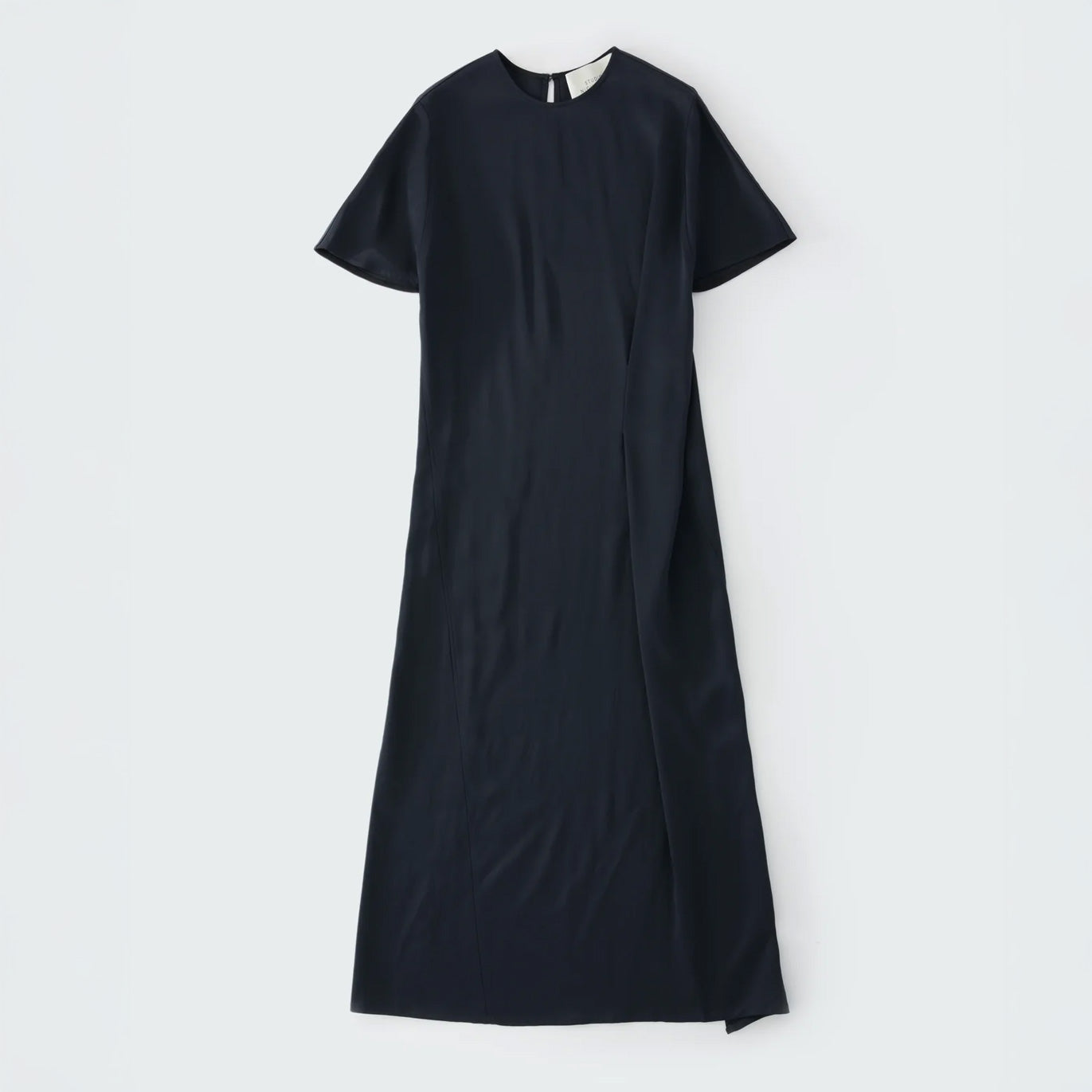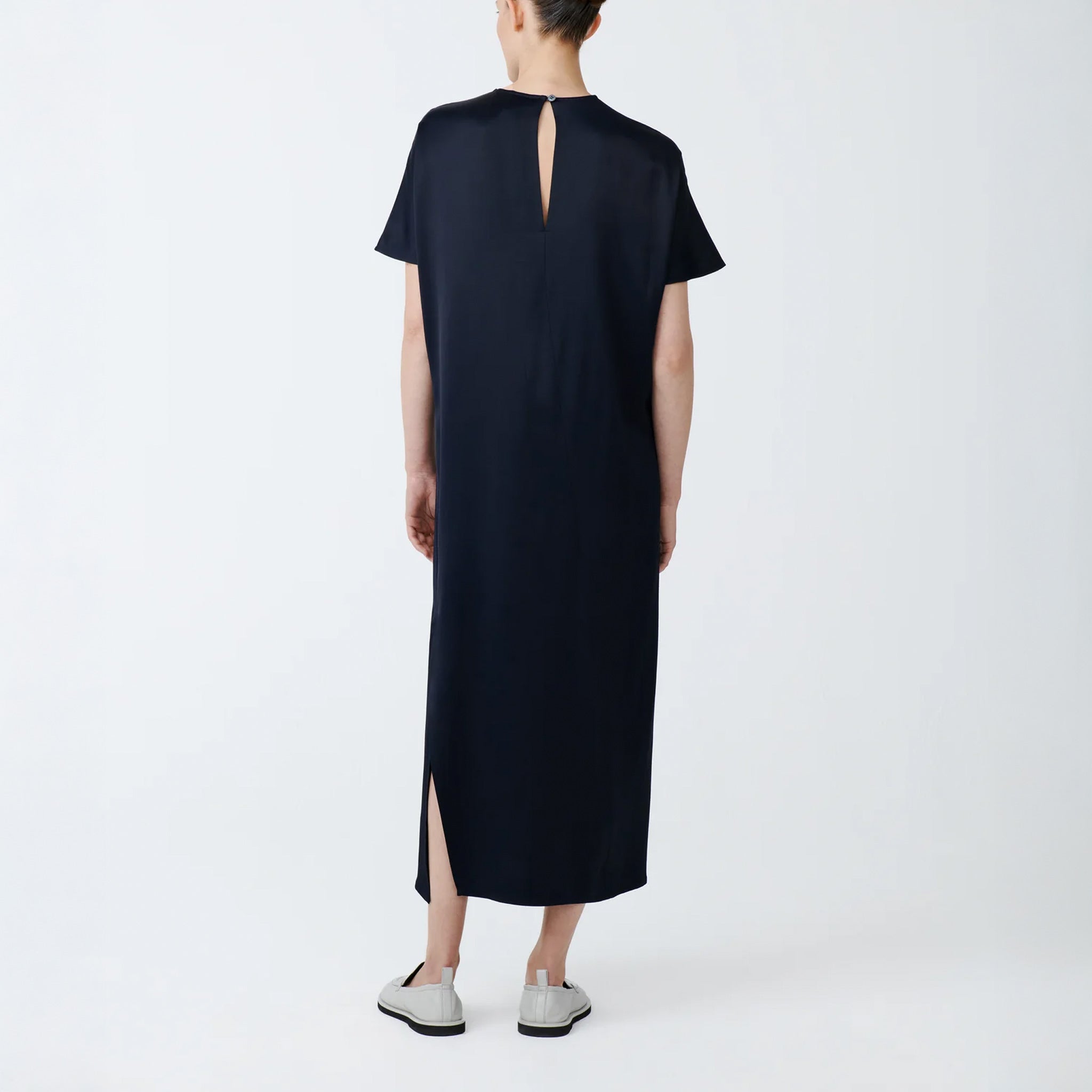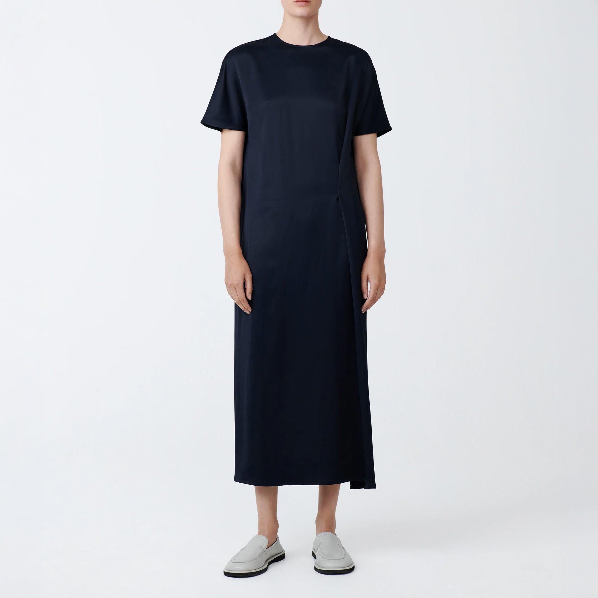 An exercise in luxurious simplicity, the Hede is a fluid dress elevated by cut, fabric and detailing. Features an asymmetrical inverted pleat detail, and seams deliberately cut to subtly twist around the body. Made from a crepe back satin fabric with a heavy drape, it's perfect for both warmer days and for layering when the temperature begins to drop.