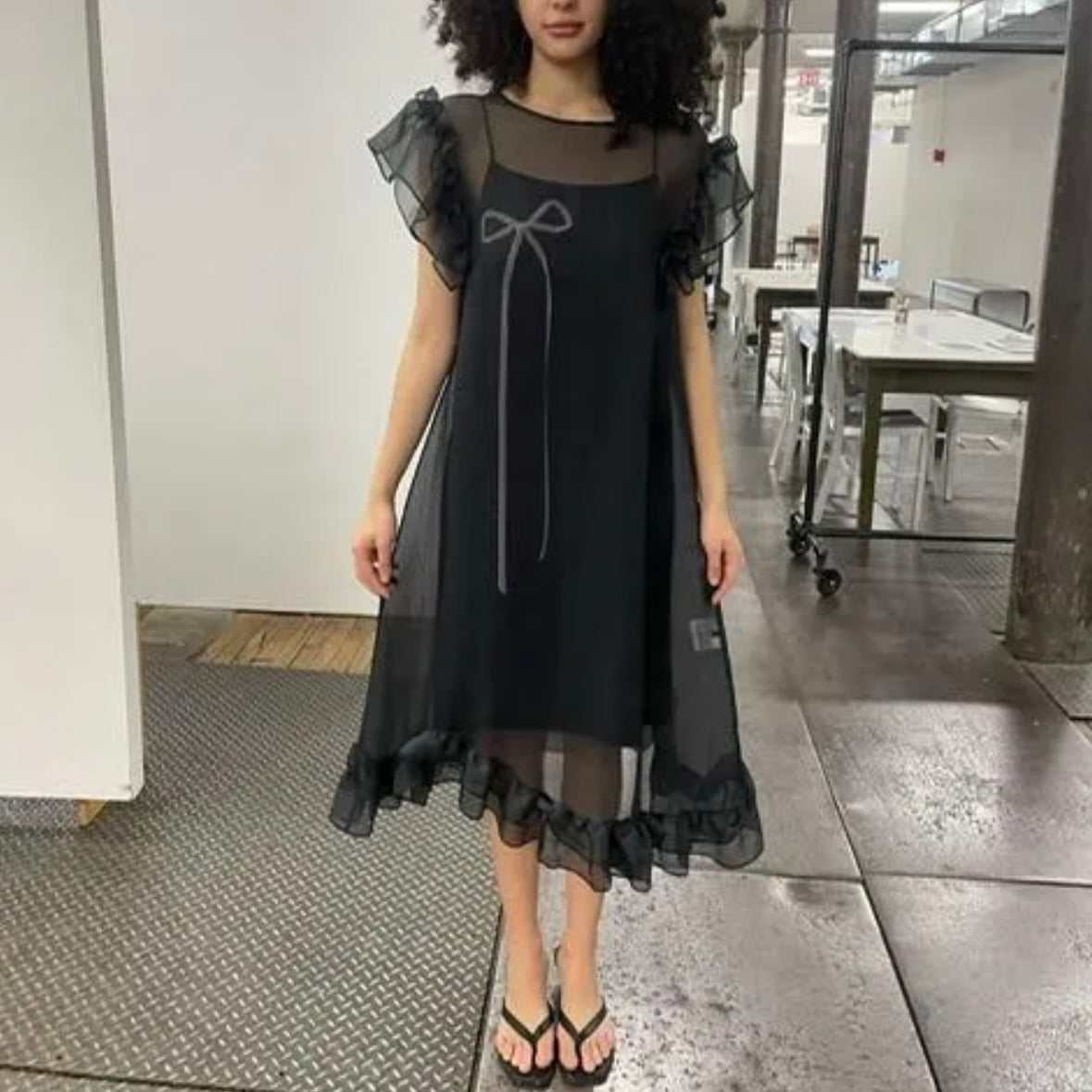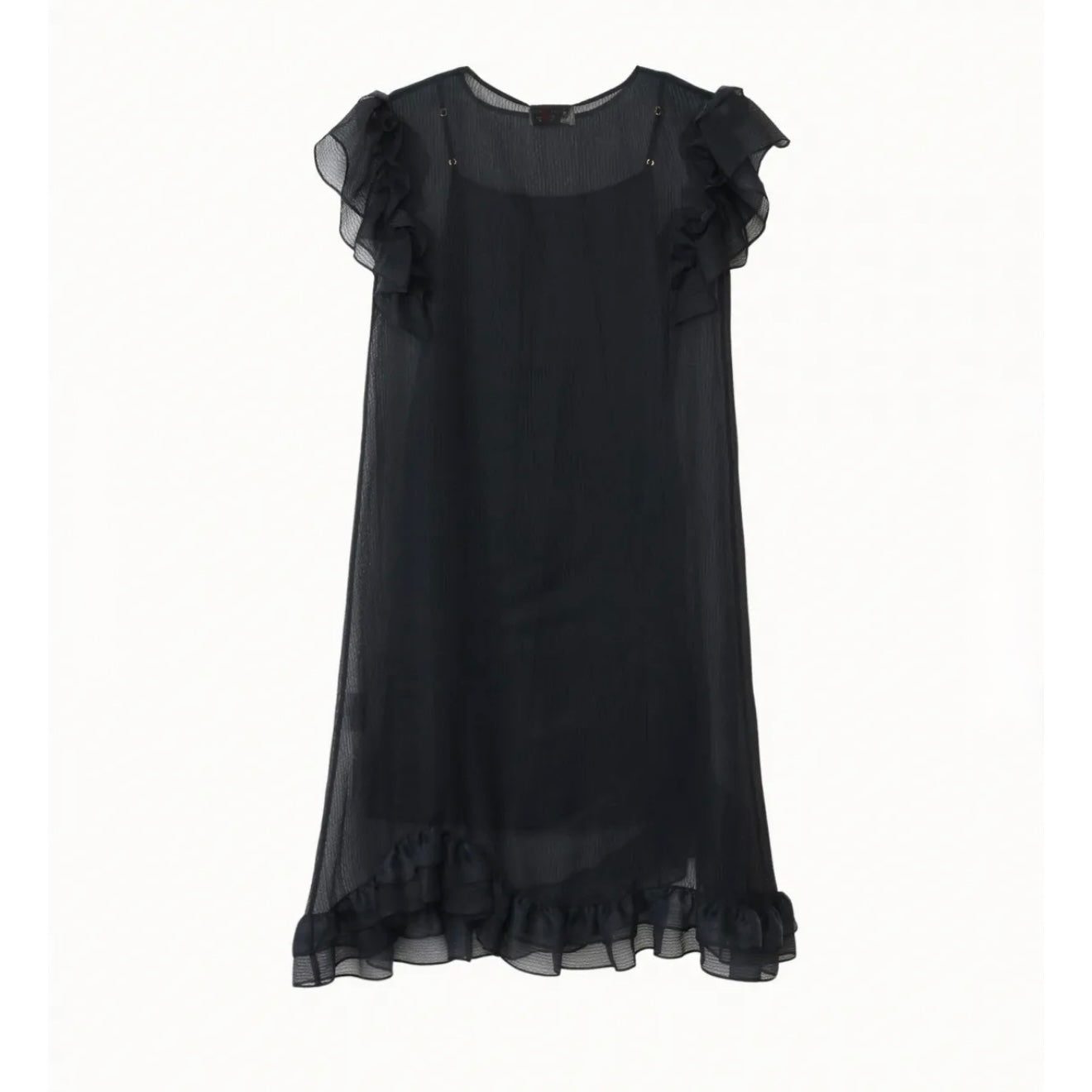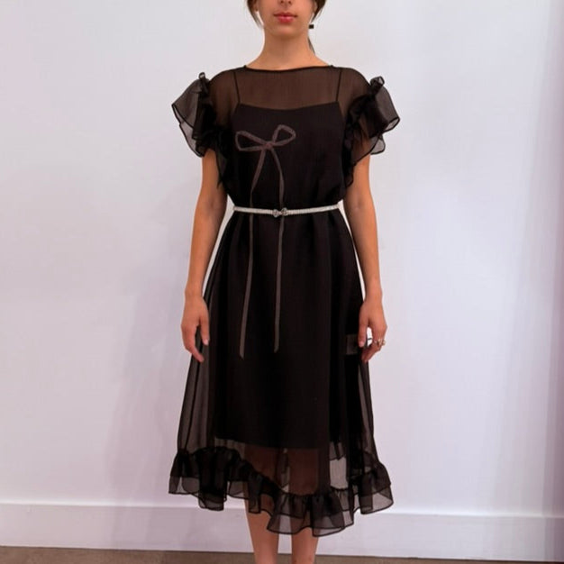 An expressive and delicate jacquard textile made with fine silk threads, taking advantage of the light and sheer organza material. The inner layer is embroidered with velvet ribbons using antique beads. The bold frills are a distinctive design.