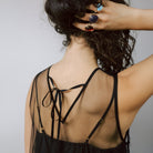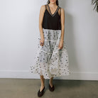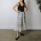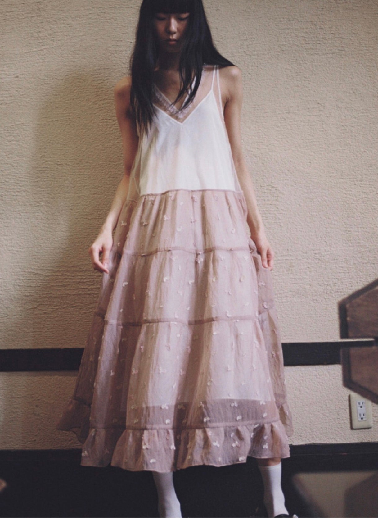 Original textile design with a flower petal motif using the on-kemi embroidery technique, featuring a voluminous tiered dress. 50% Polyester 50% Nylon. This print is exclusive to Leur Logette. It is soft and delicate; and pairing it with bright hosiery and a heeled Maryjane would make it that much more modern.