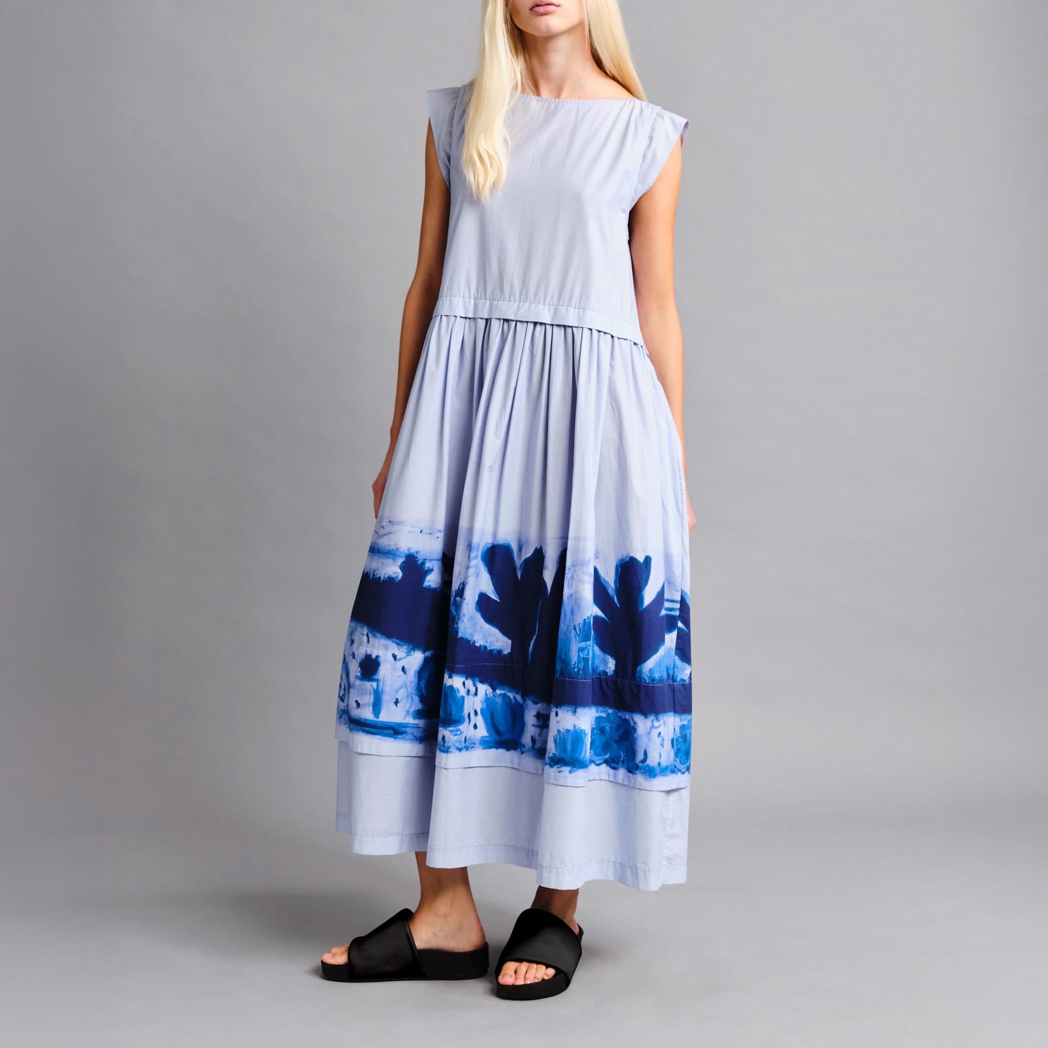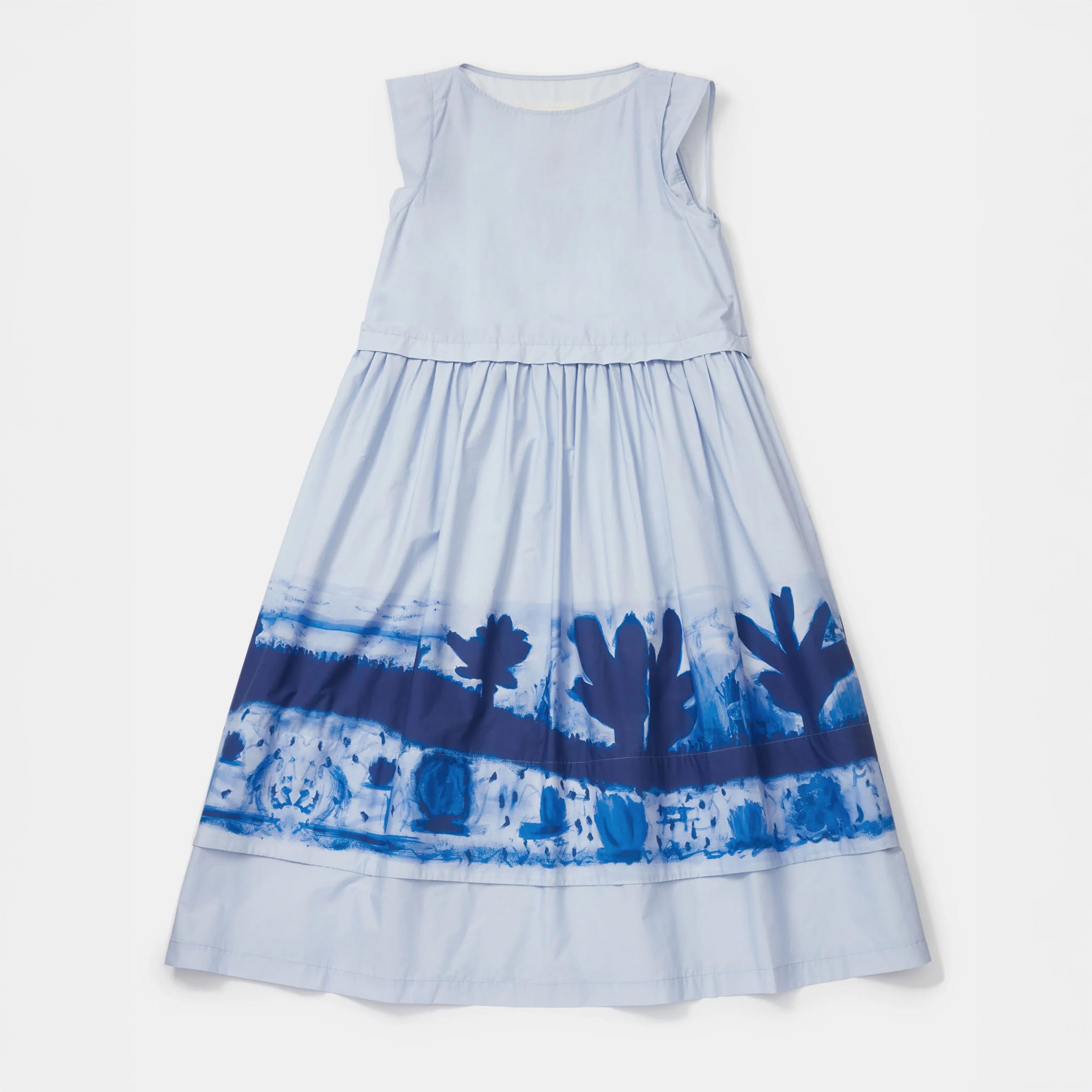 This sleeveless dress is printed with a design created by the Toogood studio. The sylvan scene, inspired by childhood memories, has a violet blue hue to evoke traditional 18th century Willow pattern tableware.