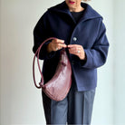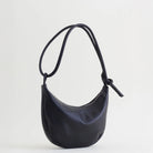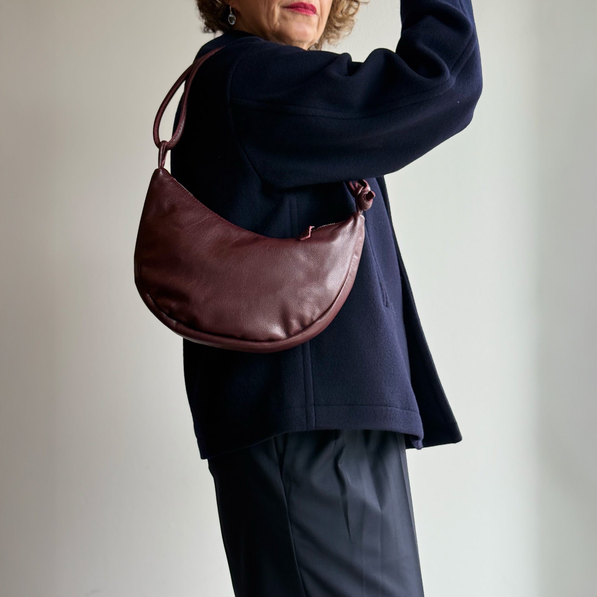 Unlined soft form crescent shaped bag with one rolled strap, knotted for adjustability, and a zipper closure. Three possible variations to wear the bag: over-the-shoulder, long, crossbody.