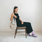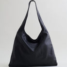 Unlined soft form shoulder bag with interior option to gather sides. Interior elastic cord with silver cord stoppers and a zipper closure. It fits a 13" laptop while un-gathered.