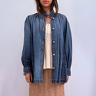 A voluminous jacket using 10oz denim with plenty of gathered details. The front features original buttons, adding a unique touch to the design.