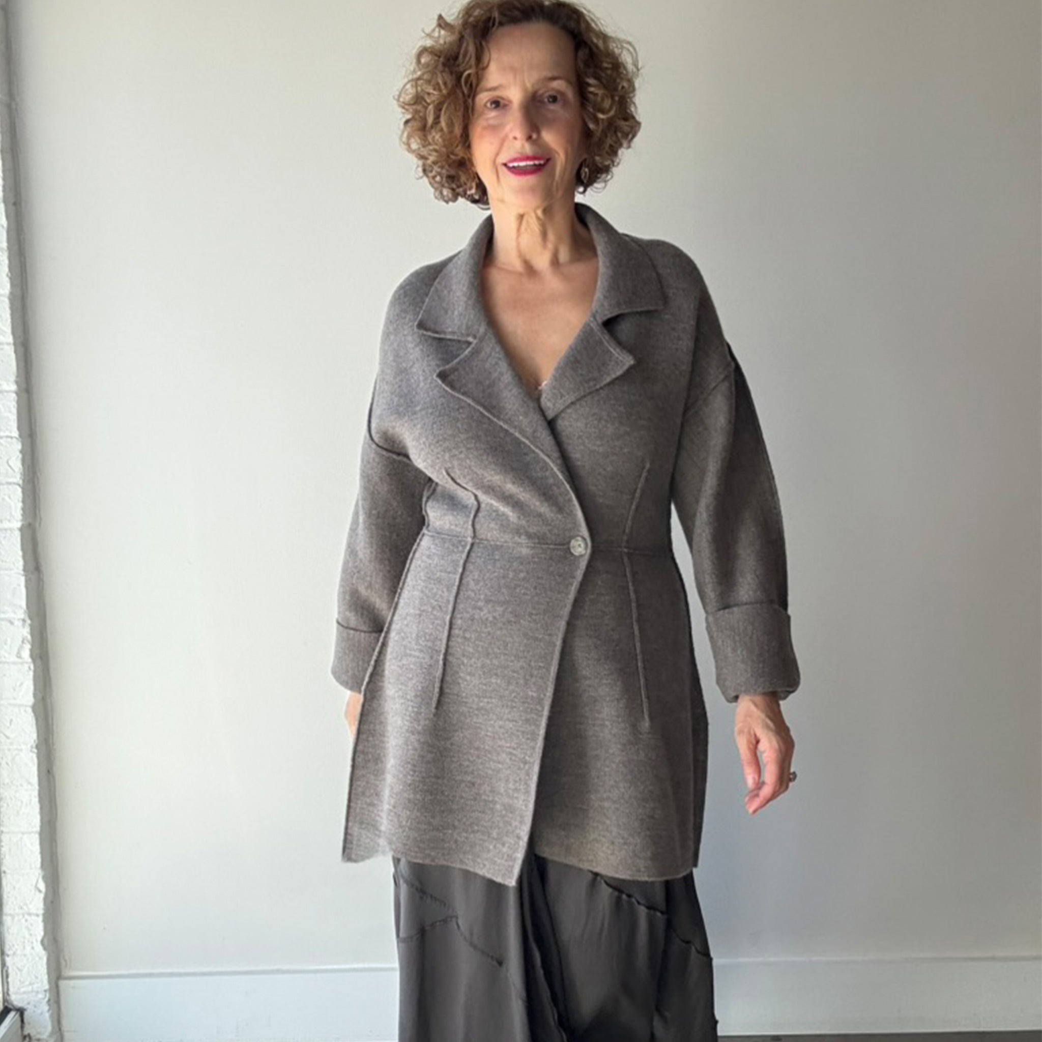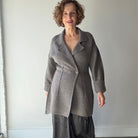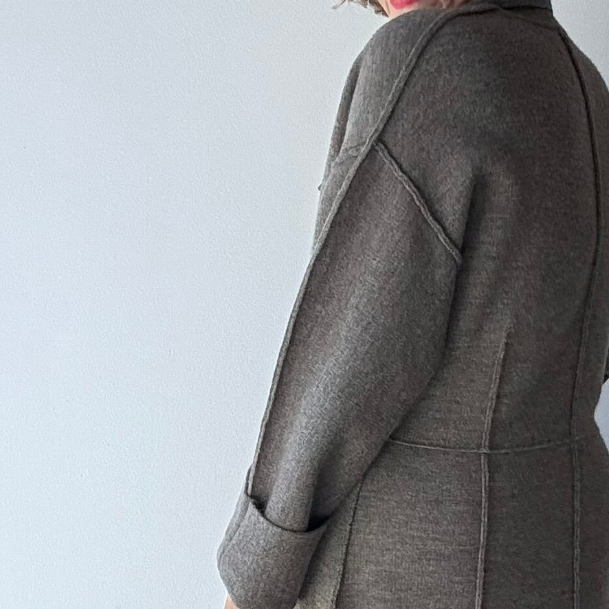Double Knit Blazer has a soft structured silhouette, featuring exposed seams and a tapered waist shaping, recycled paper buttons and subtle melange tones.