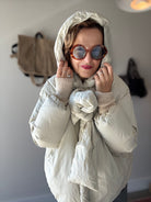 This incredibly cozy and lightweight Down coat is hooded, zip front and features a removable scarf. It is coil and casual but nevertheless, elegant. So good!