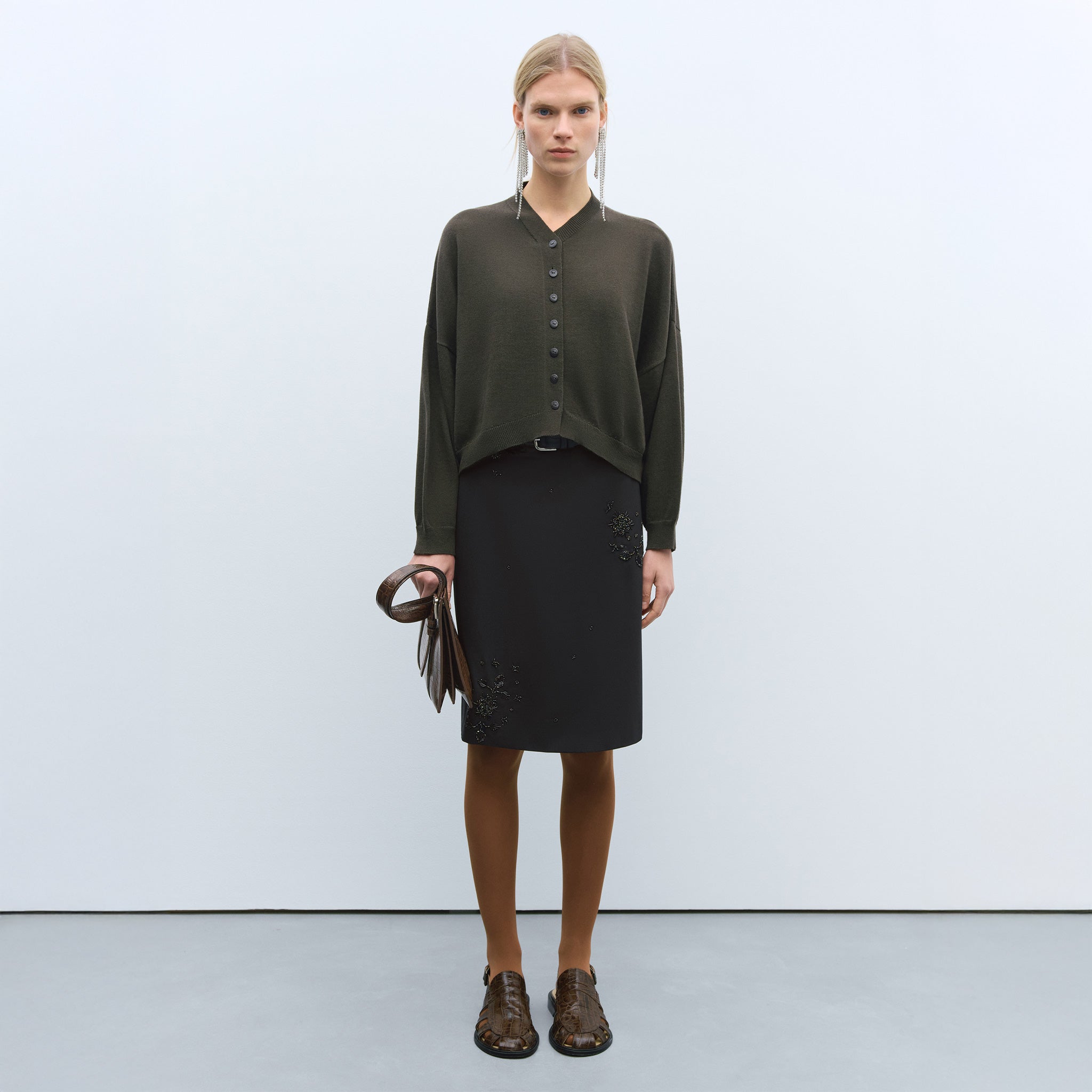 Crafted from a soft cotton, this cardigan will be a must-have in your transitional wardrobe. Loose fit and cropped shape, slightly shorter on the front, with buttoned placket and ribbed trims. Details includes an asymmetric neckline and a v-opening on the back.