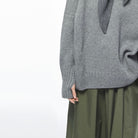This oversized sweater features a collar and special detail at cuffs and hem. It’s a lovely wool, which feels considerably light and airy.