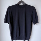 Extra fine merino wool crewneck sweater with short sleeves in a dark navy melange color.