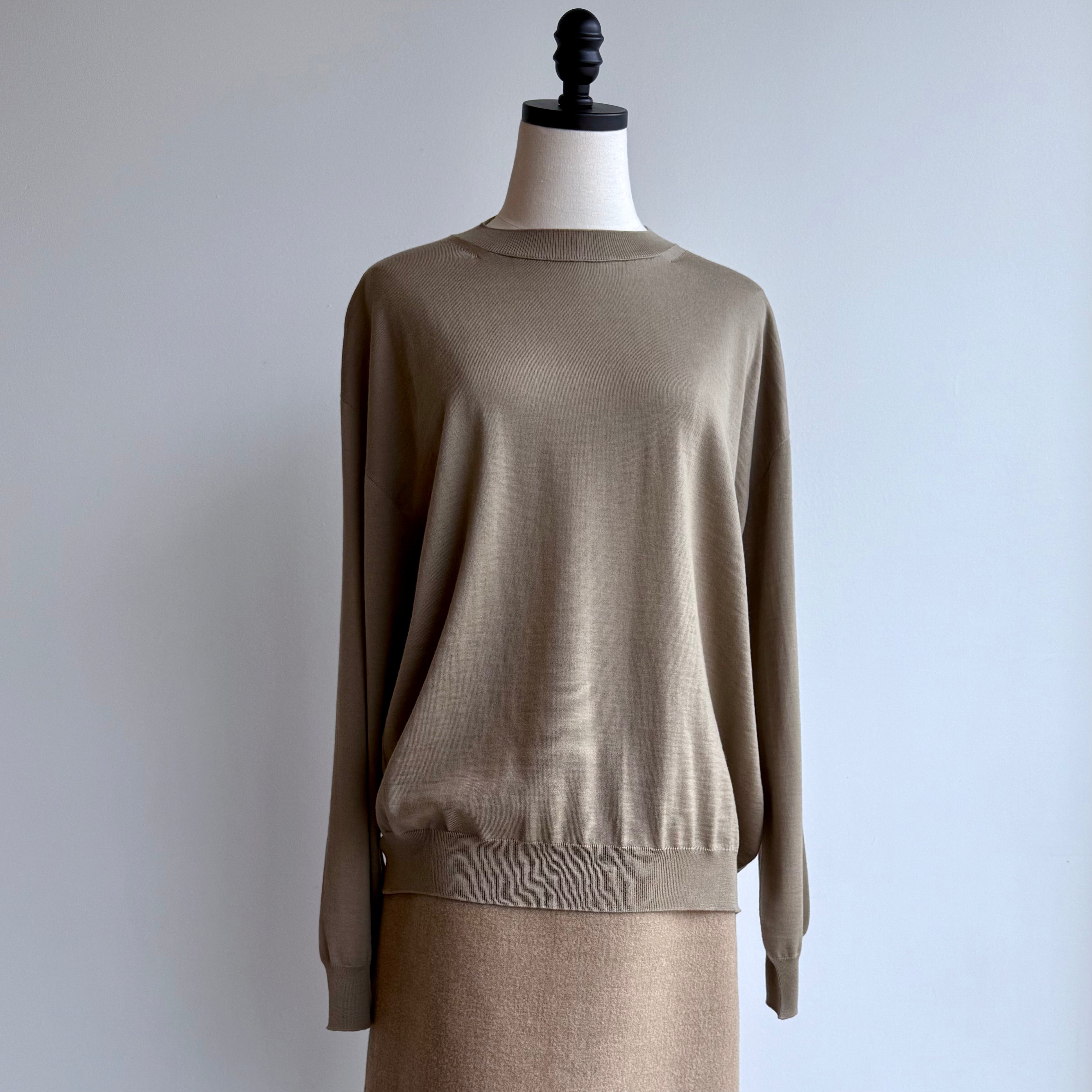 An extra fine merino wool, long sleeve, crew neck knit pullover with hemming on the bottom, wrists, and neckline.