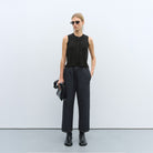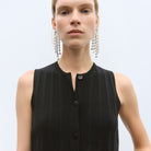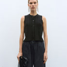 A modern cropped waistcoat crafted in a ribbed texture. Designed with wide armholes and a boxy fit, it features a wavy round neckline and delicate button closures at the front. A sleek and versatile piece for layering or standout minimalist looks.