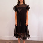 An expressive and delicate jacquard textile made with fine silk threads, taking advantage of the light and sheer organza material. The inner layer is embroidered with velvet ribbons using antique beads. The bold frills are a distinctive design.