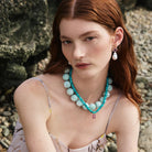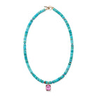 Natural turquoise heishi and faceted heat treated ruby beaded necklace with 14K yellow gold and pink topaz charm, and a 14K yellow gold toggle and ring closure.