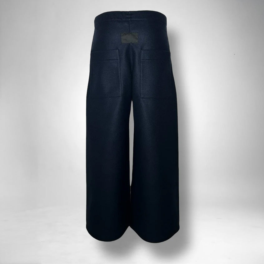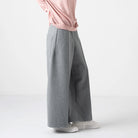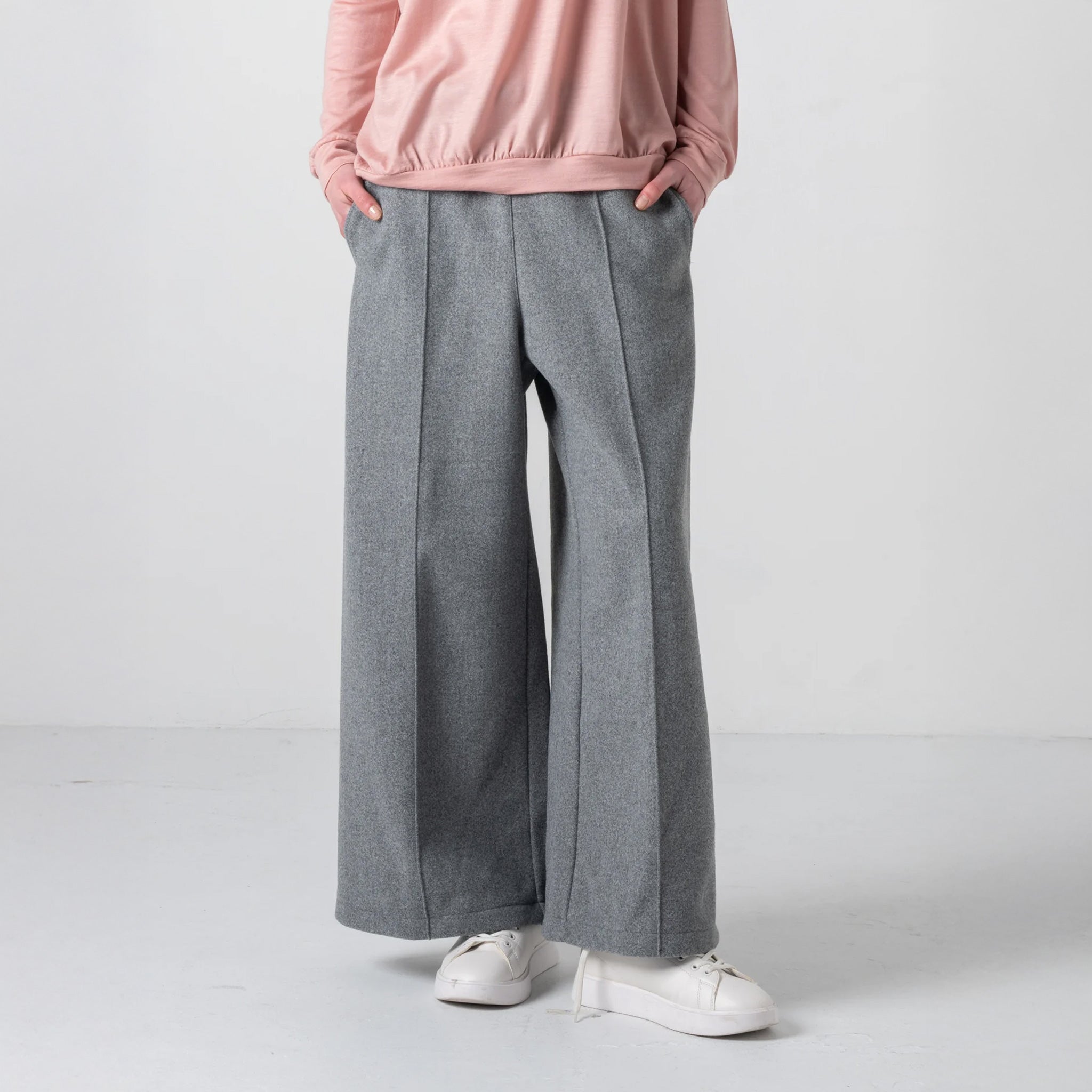 Unlined wide-leg trousers with center crease line stitching and hip slash pockets. These stylish trousers are constructed with no seams at the sides and a flat waistband, allowing for a clean look around the waist despite the sturdy fabric. Featuring an elastic adjuster inside the waistband for a perfect fit and large patch pockets placed low at the back for a casual look.