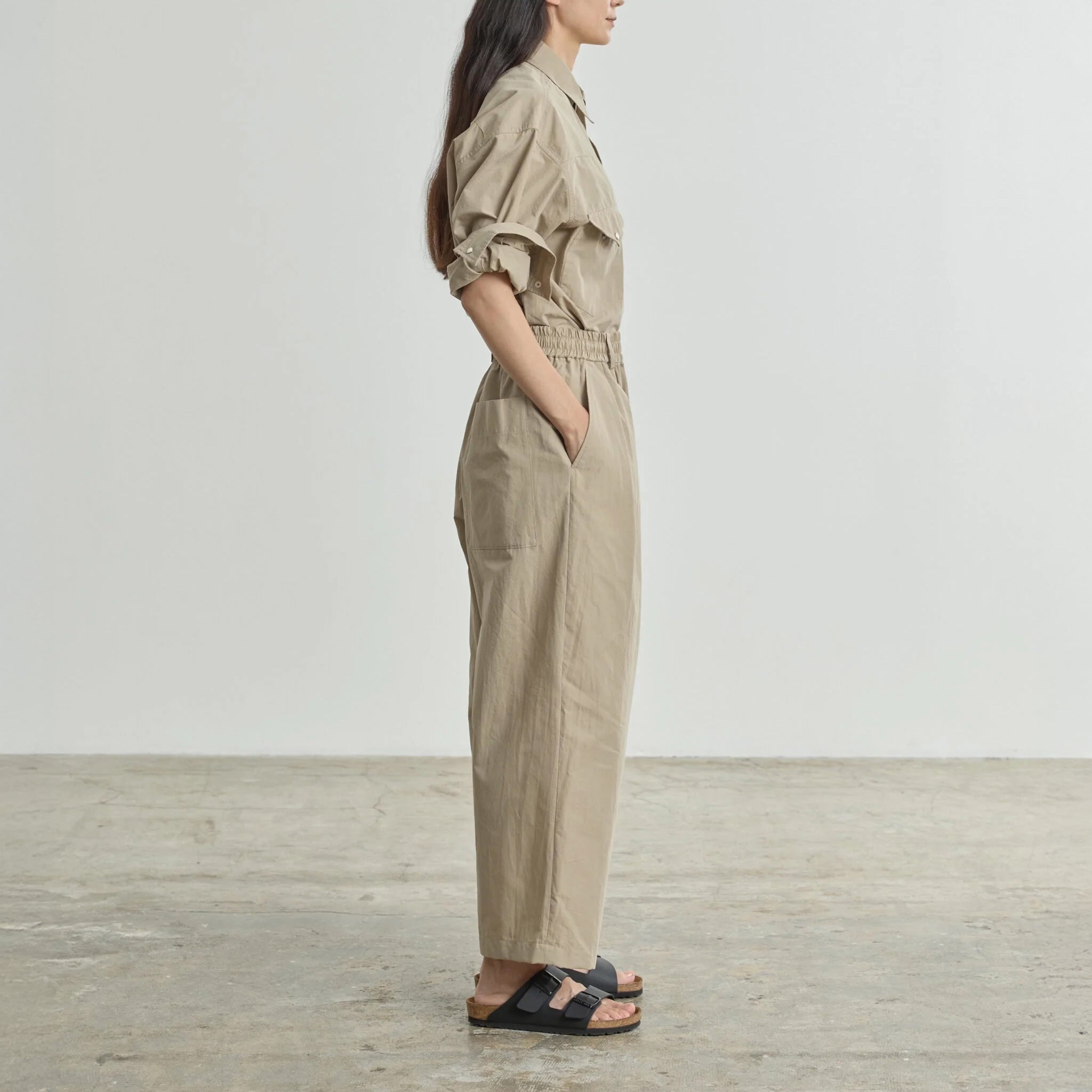A classic staple for Nicholson and Nicholson, the Hakama pant can be found in every season's collection. This spring we bought in a super soft and lightweight cotton poplin in Black (image shown for style only). Hakama is a wide pant with an elasticized waist. Featuring drawstrings at the waist, so it can be cinched as much as you'd like, and at the hem, so it can be gathering like a jogger. Slit front pockets make it functional, while one patch pocket on the back makes it that much better.