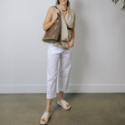 An easy pant with side zipper and raw detail at the (elastic) waist.