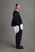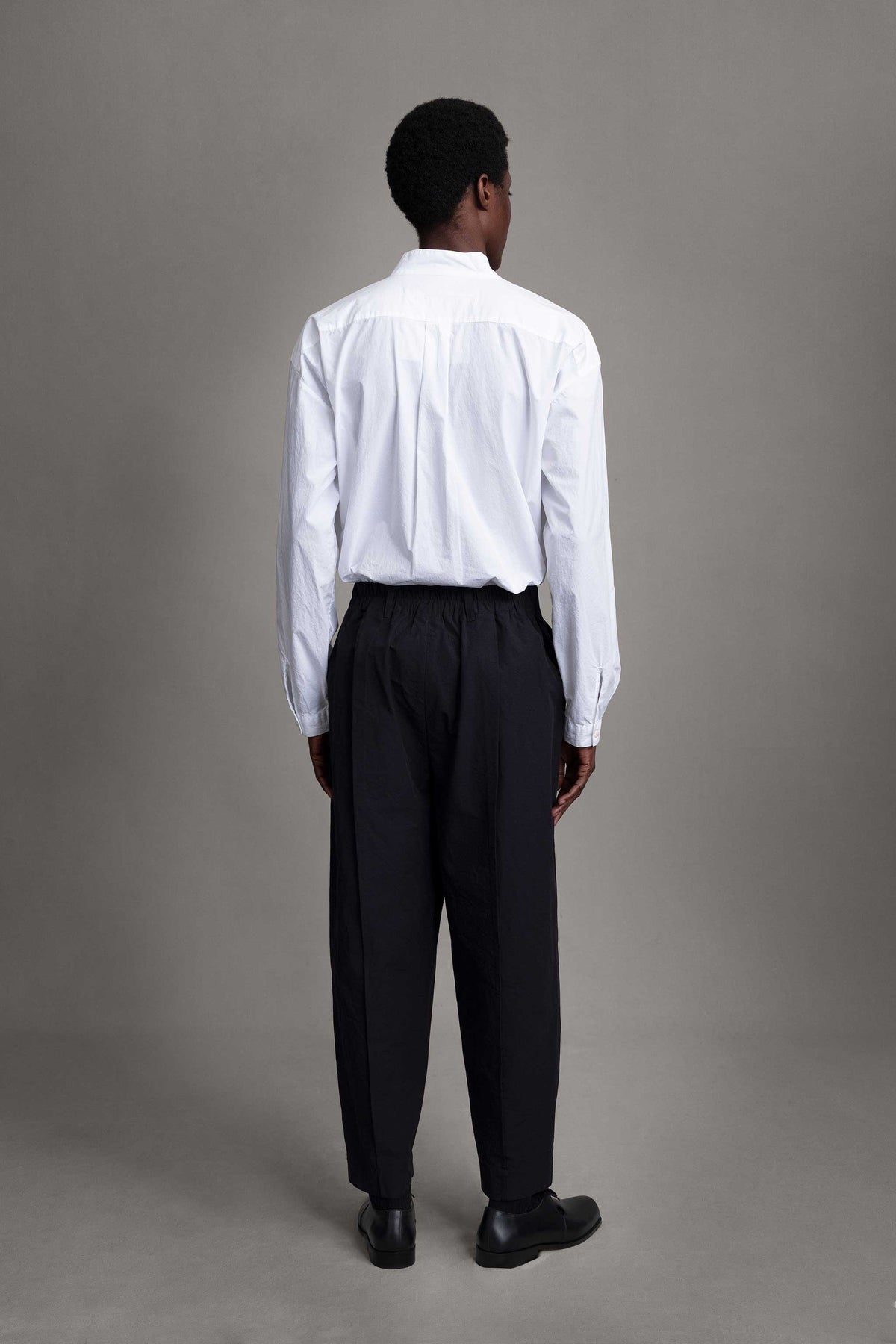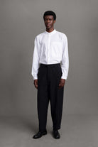 Half elasticated, half tailored trouser, giving a sense of elegance and elevated suiting while also being comfortable and adaptable. A generous dart formed at the waist is continued down the front and back of the trouser to a pin tuck. The generous volume forms into a significant taper at the ankle.