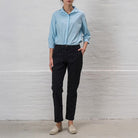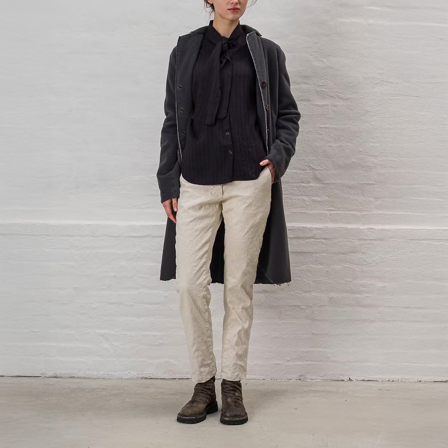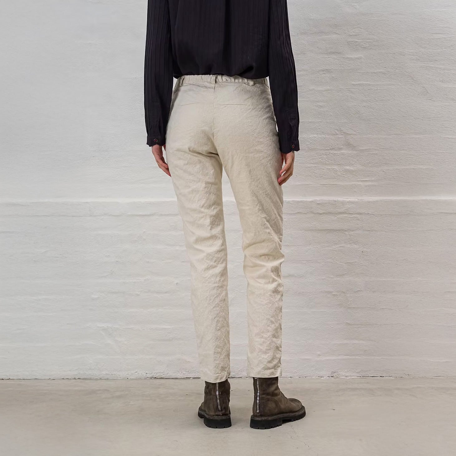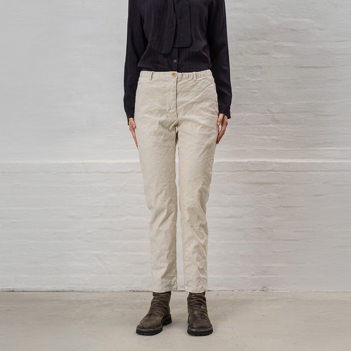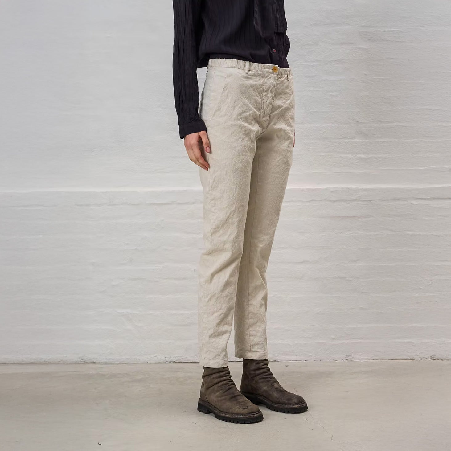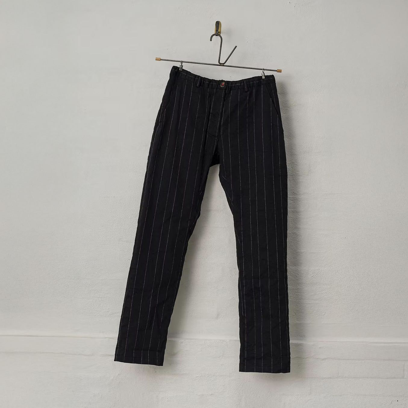 Slim straight cotton-steel blend pants. Button and zip closure, stitched with signature red cotton. Features an elasticated waist and side pockets. Lined. *Available in Black Stripe.