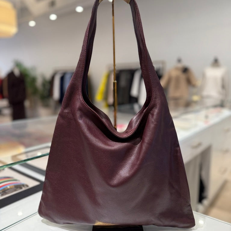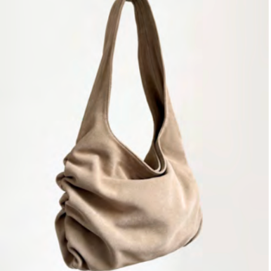 Unlined soft form shoulder bag with interior option to gather sides. Interior elastic cord with silver cord stoppers and a zipper closure. It fits a 13" laptop while un-gathered.
