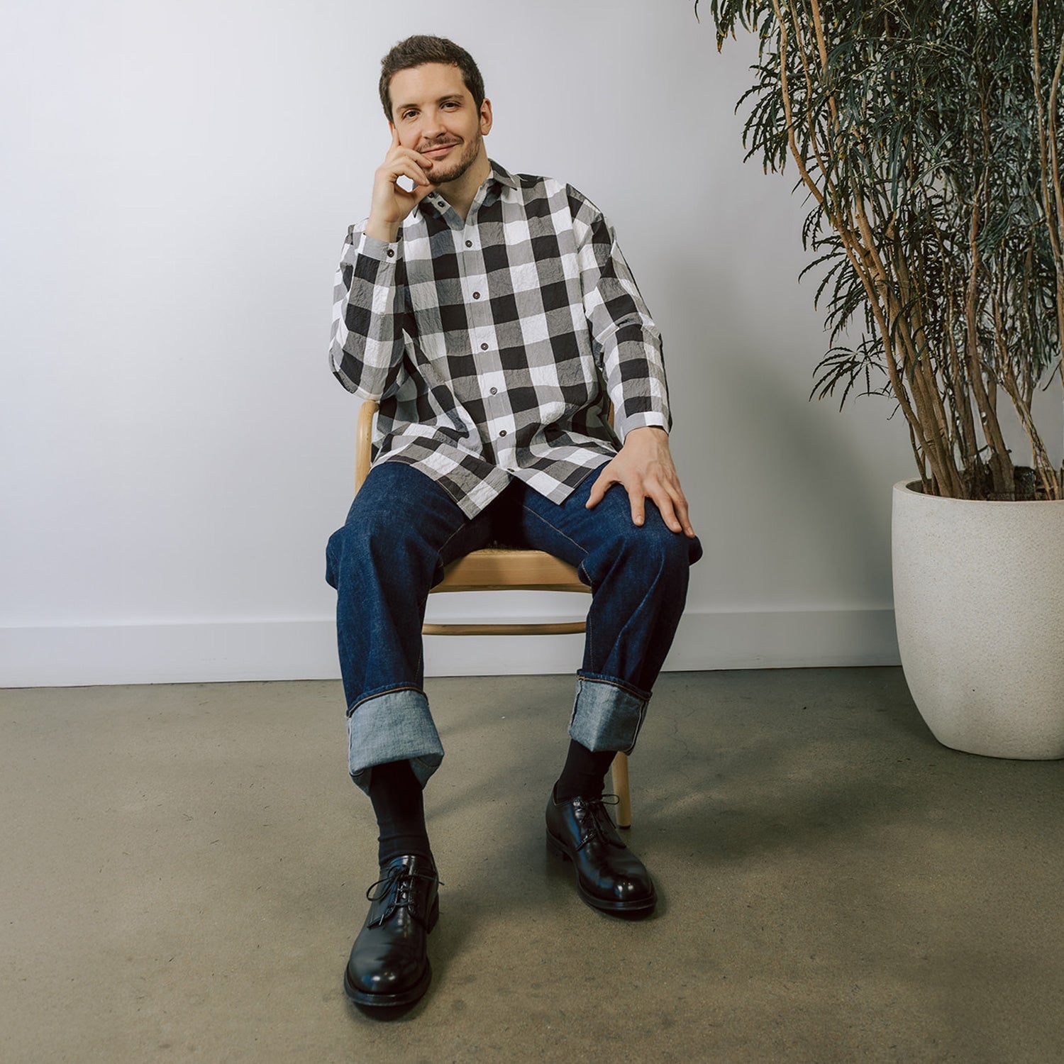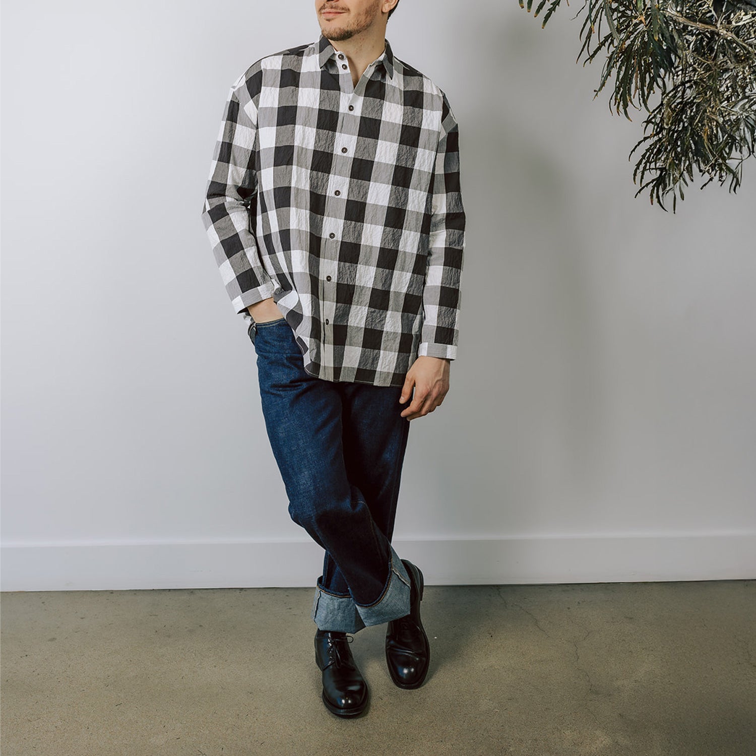 Toogood's classic shirt, the Draughtsman, is made in a bold gingham cotton check woven for Toogood in colors coffee and chalk. The Draughtsman is a square cut shirt, relaxed over the shoulders with a generous fit and volume in the body. The shirt is finished with a neat pointed collar and narrow buttoned cuffs.