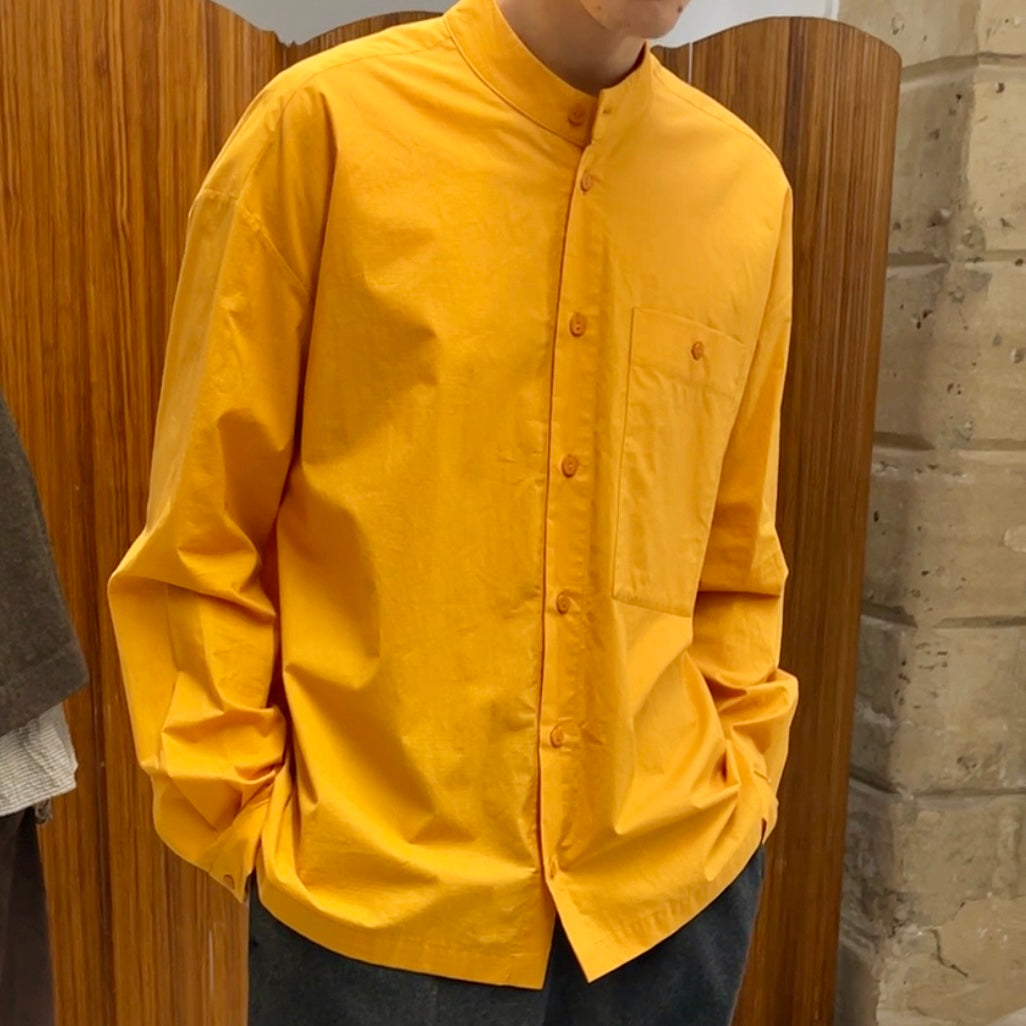 A close fitting unisex shirt. Generous stand collar, with a large utility left breast pocket and generous box pleat through the back yoke. Straight hemline and slender through the cuff.