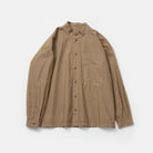 A close fitting unisex shirt. Generous stand collar, with a large utility left breast pocket and generous box pleat through the back yoke. Straight hemline and slender through the cuff in a poplin cotton fabric.