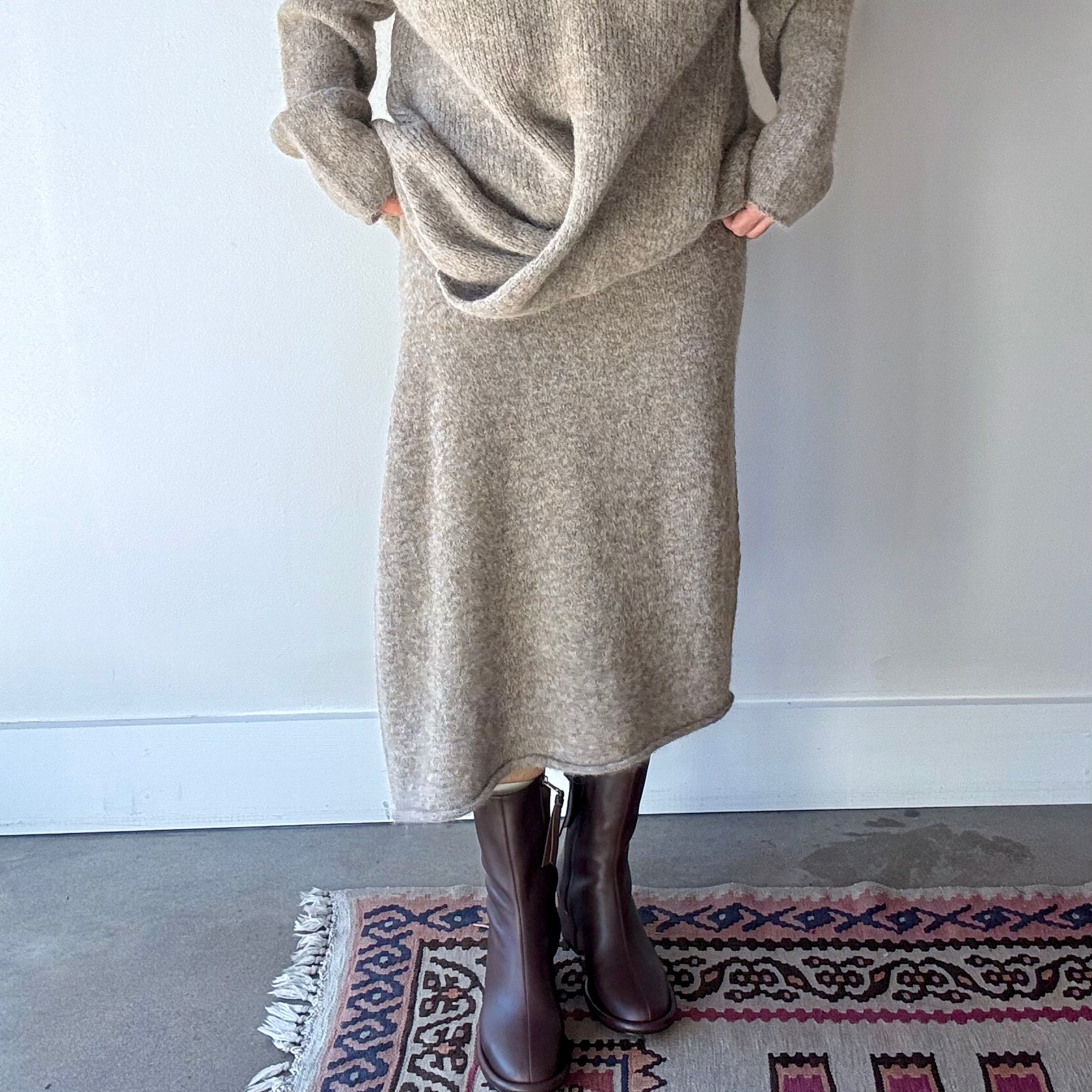 Cozy knit askew skirt has a soft textured hand and elasticated waist.