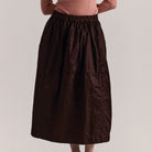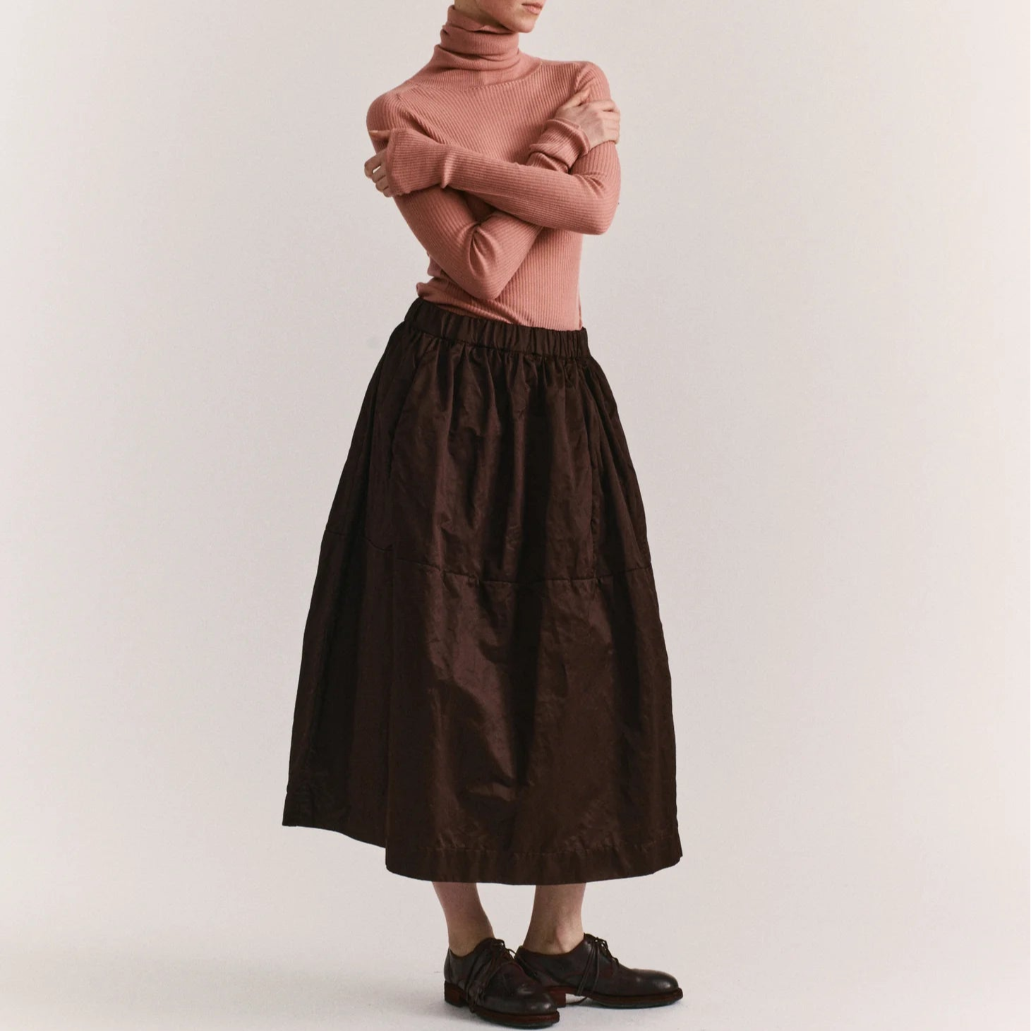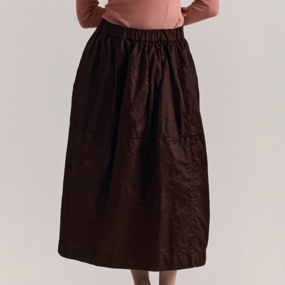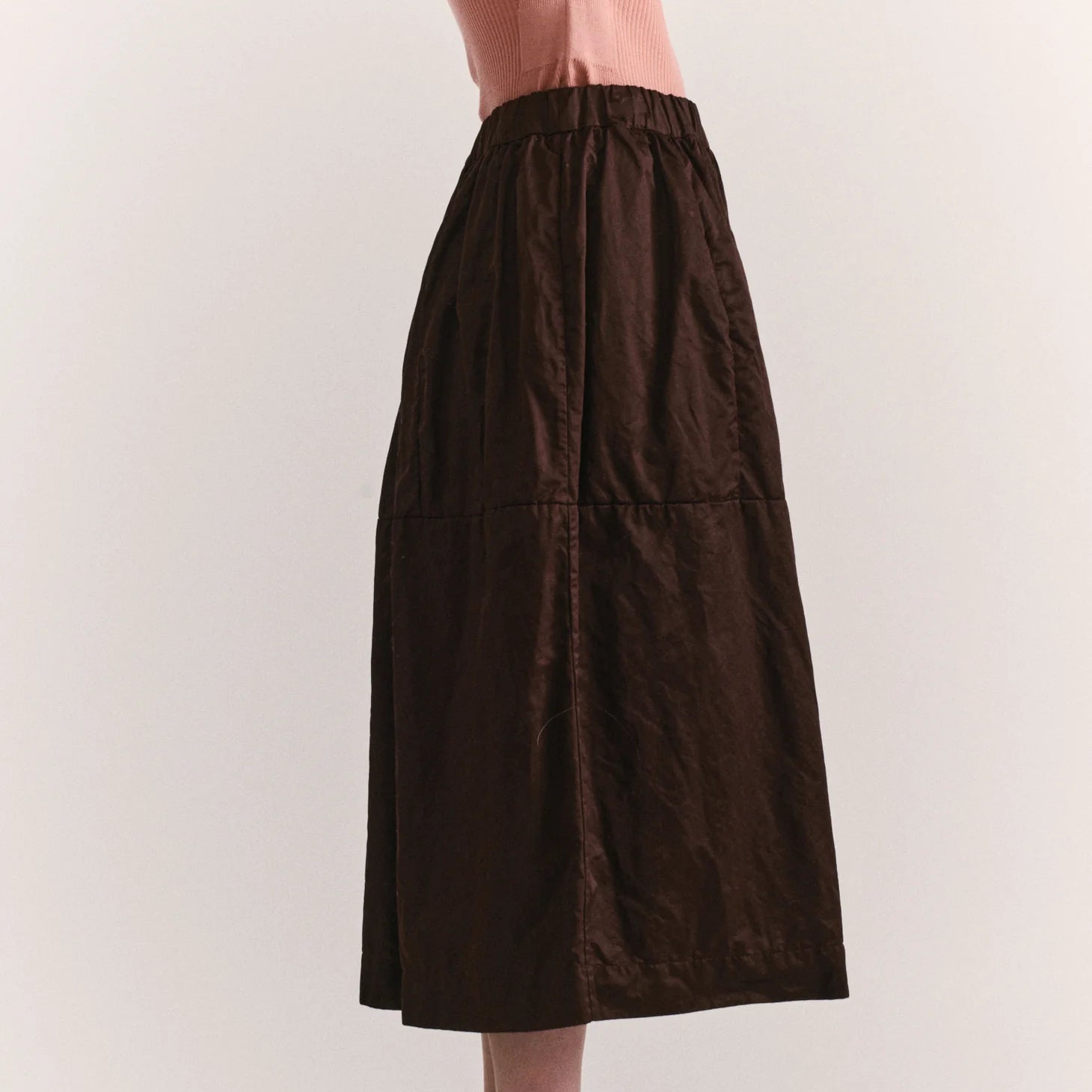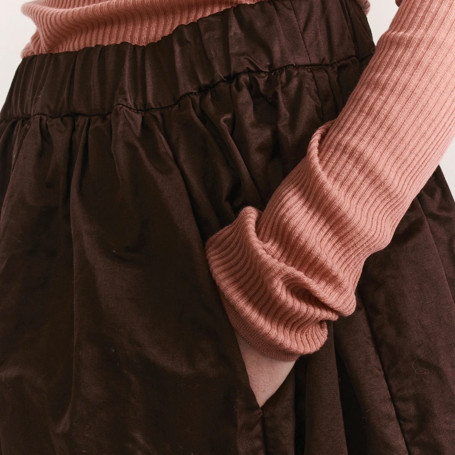 This skirt has an elasticated waist and interior drawstring. It’s offered in L Satin washed finish and ruffle details all around the waist line above the cut. Featuring pocket in the front seam.