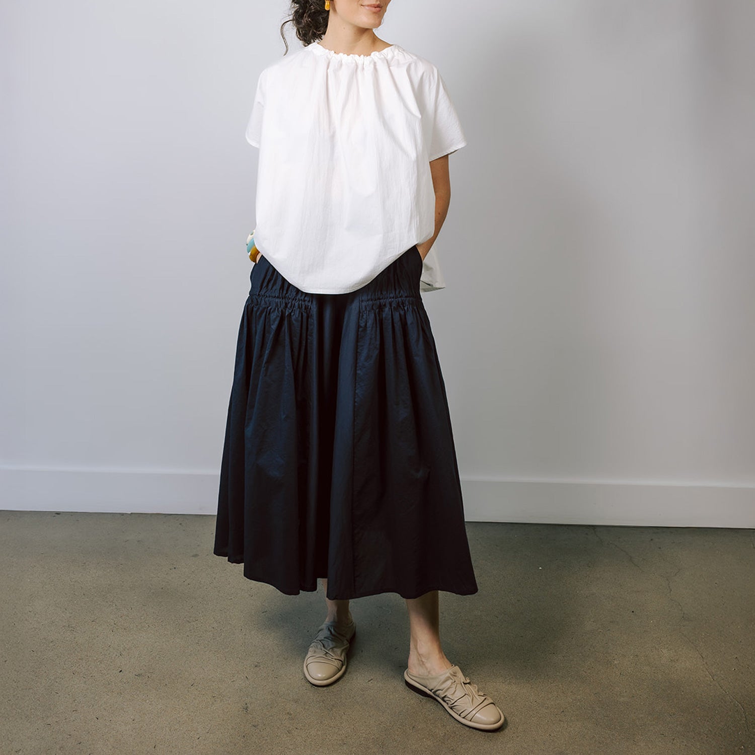 An easy fluid full summer skirt with softly scooped gathering panels that allows fullness at the sides.