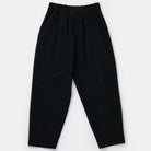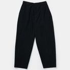Half elasticated, half tailored trouser, giving a sense of elegance and elevated suiting while also being comfortable and adaptable. A generous dart formed at the waist is continued down the front and back of the trouser to a pin tuck. The generous volume forms into a significant taper at the ankle.