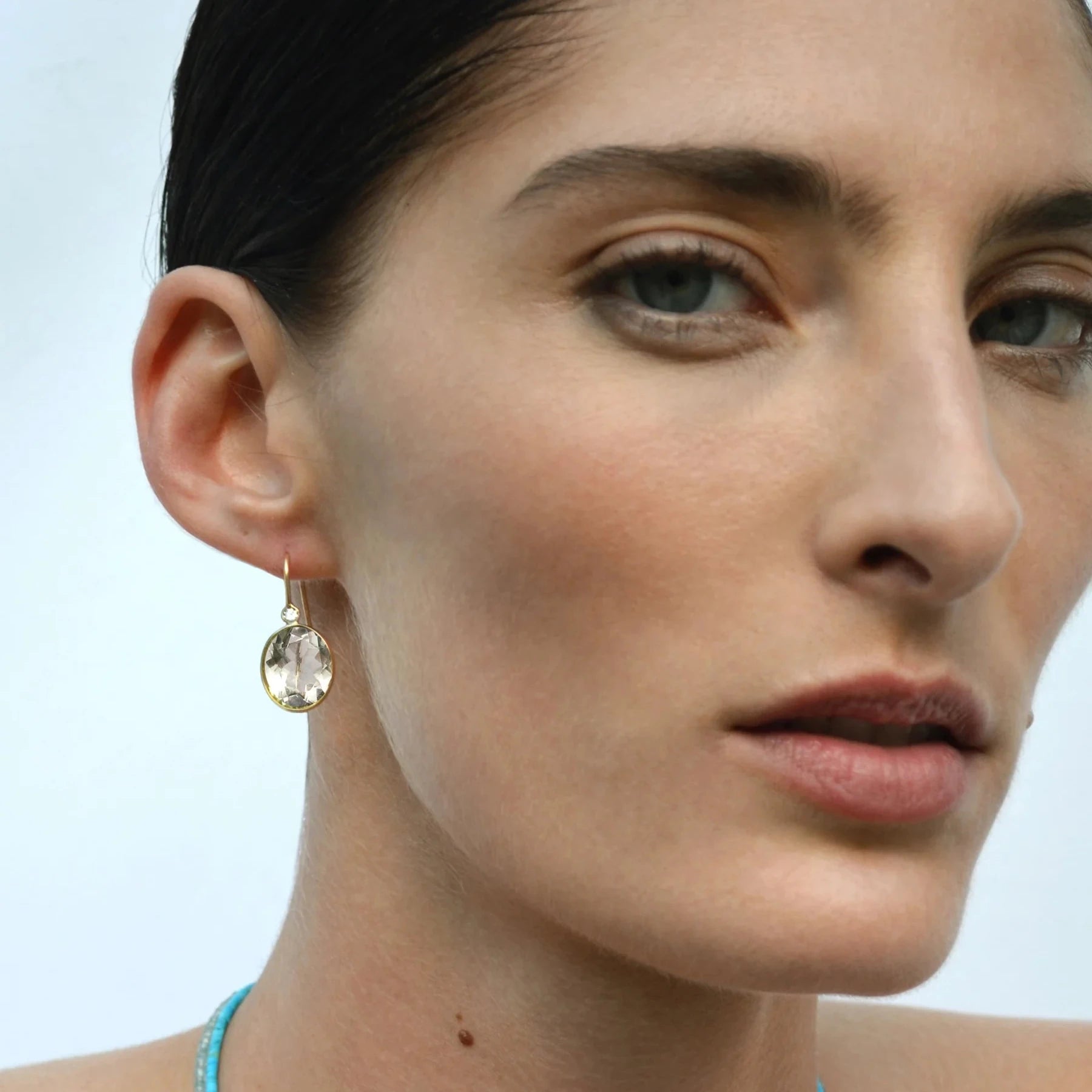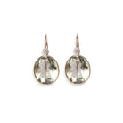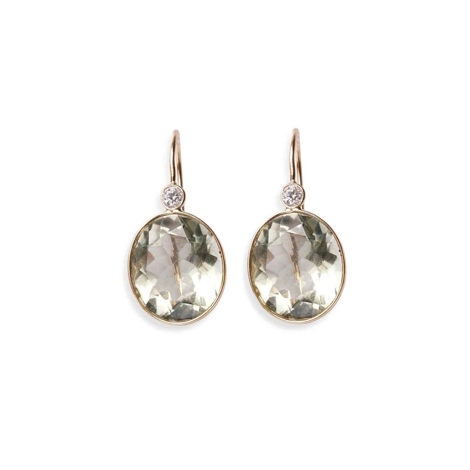 These 'Pool' silhouette earrings are classic 14k gold beauties, featuring faceted semiprecious green amethyst ovals with diamond accents.