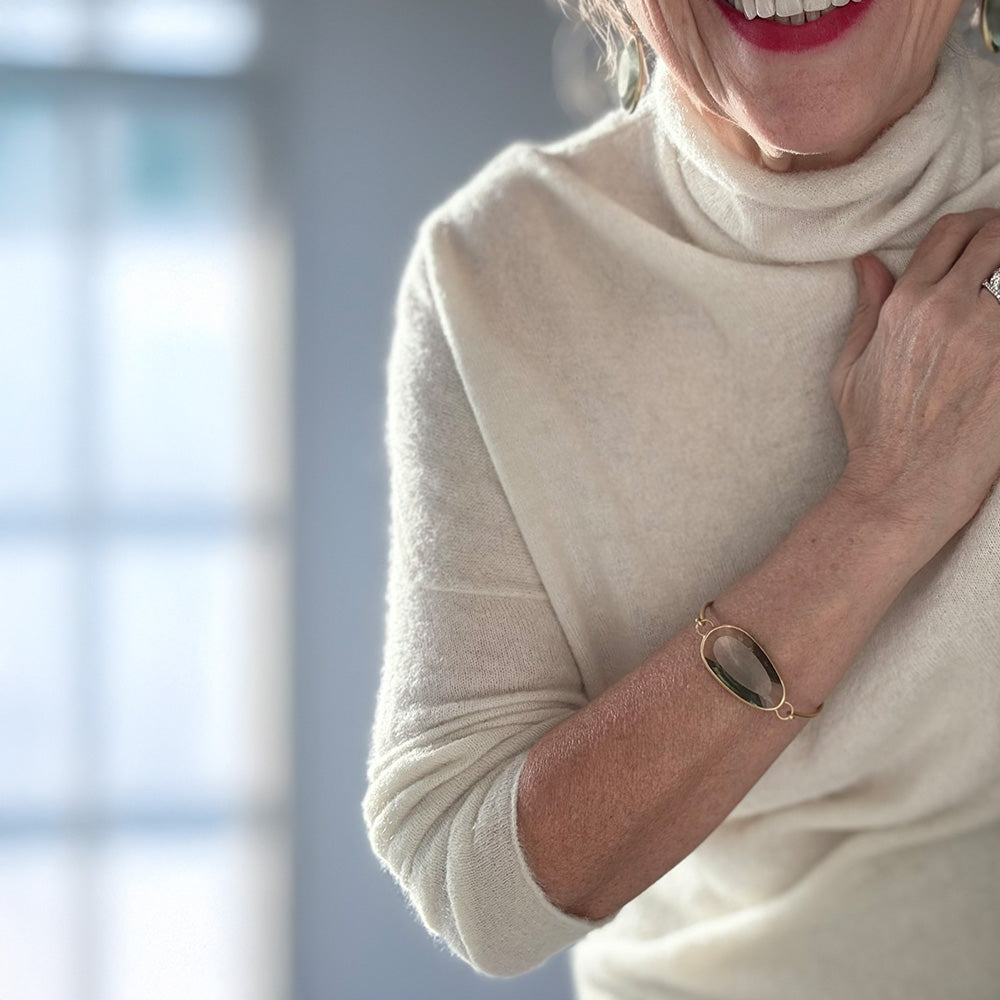 This extraordinary gem inspired our Koh-i-Noor collection. We've reimagined this legendary cut using clear Aquamarine, Green Quartz, and Rainbow Moonstone. Stately, primary, and powerful, each piece captures the spirit of the original masterpiece.