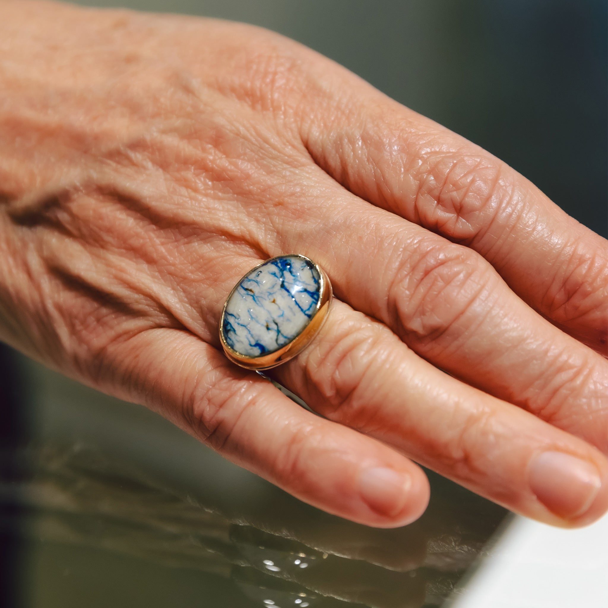 14k gold and sterling silver ring with oval Azurite in Quartz on soft live edge band.