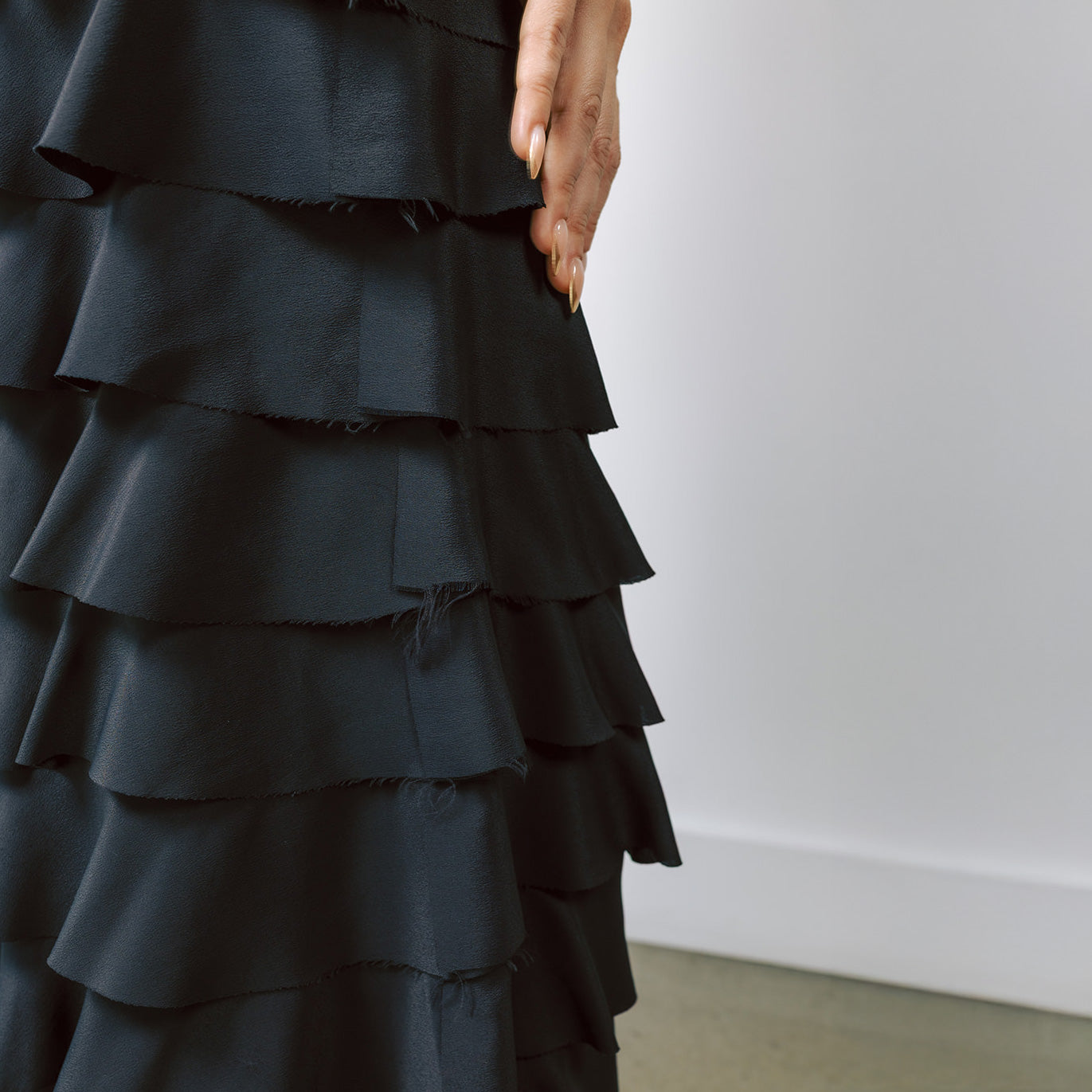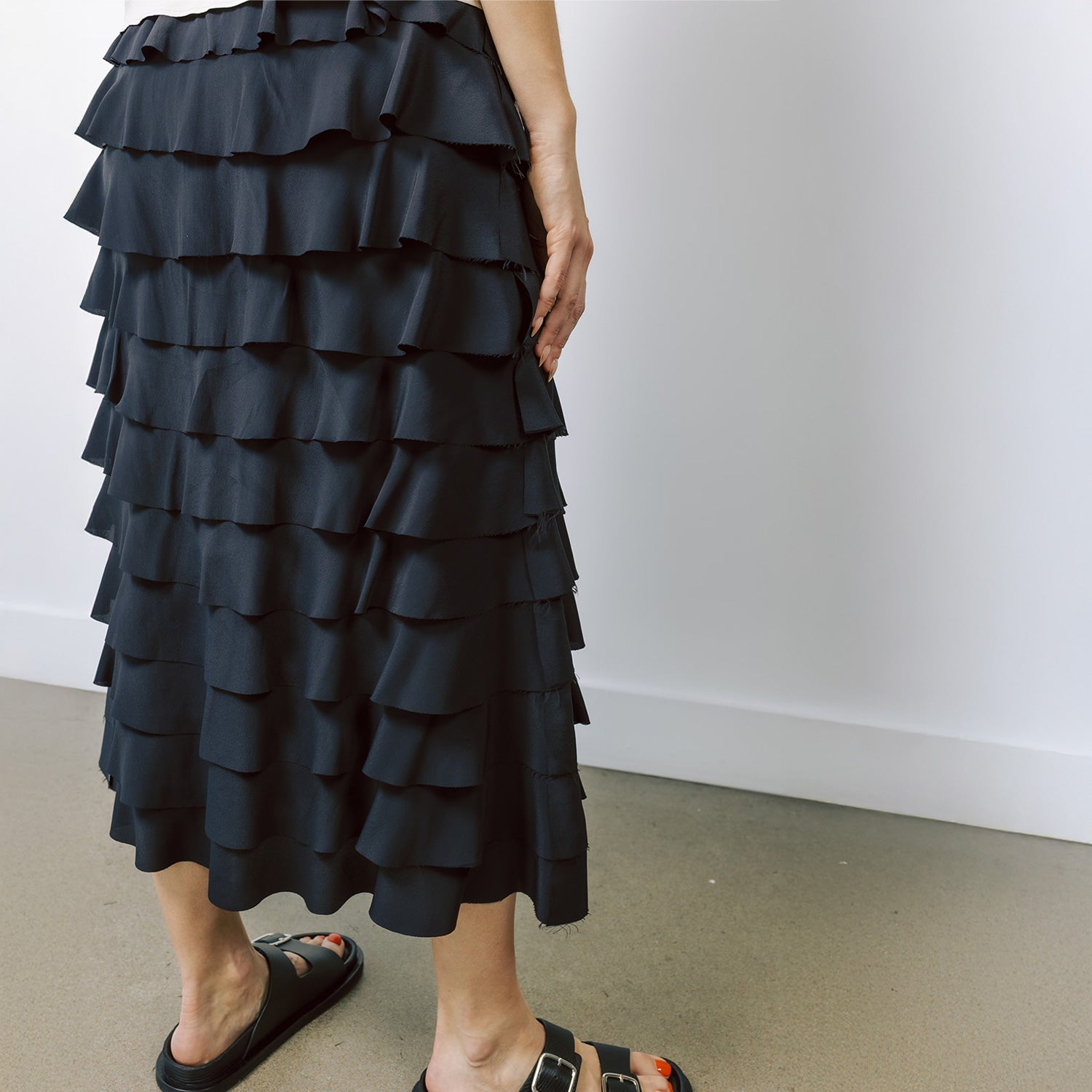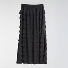 This tiered ruffles skirt with elastic waist can be dressed up or down.